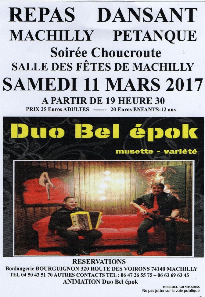 Machilly Pétanque organise une soirée choucroute le Samedi 11 Mars à partir de 19h30. L’évènement se tiendra à la salle des fêtes de la commune, où un orchestre animera la soirée. Prix : 25 euros.